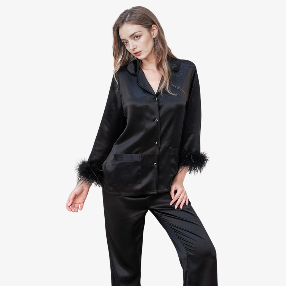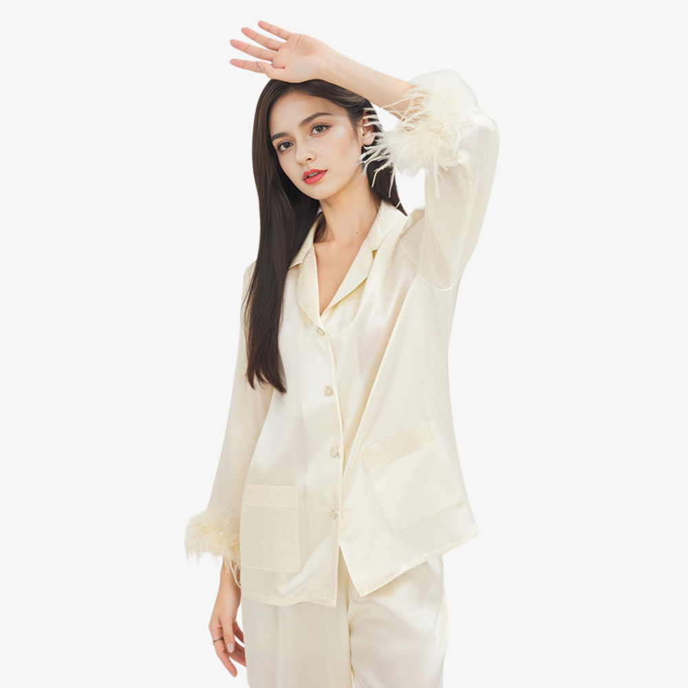Slip into comfort and a touch of whimsy with this 19 Momme 100% Mulberry Silk Feather-Trim Pajama Set. Made from smooth, breathable mulberry silk, it feels cool, soft, and gentle on the skin—perfect for slow mornings or quiet nights at home.